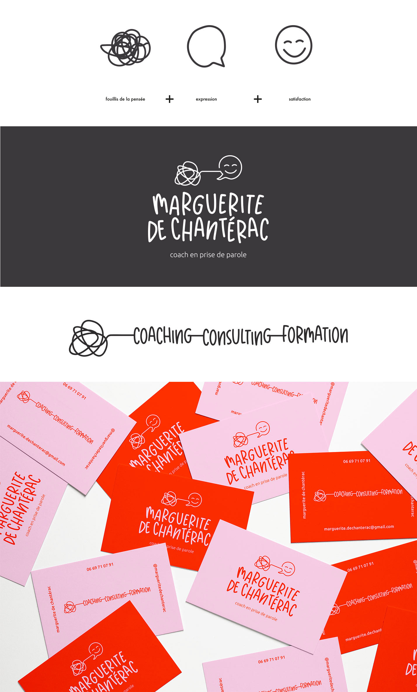 Proposition d'identité visuelle pour la coach en prise de parole Marguerite de Chantérac. Elle accompagne les gens à prendre la parole en public, à construire leur discours et à communiquer de manière globale.
