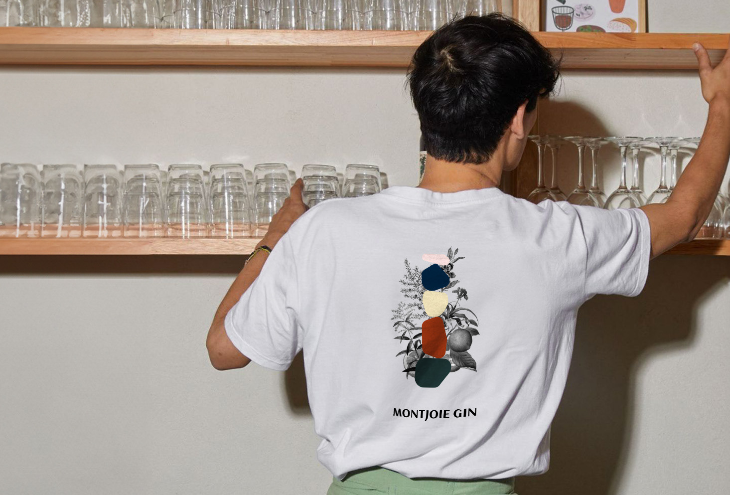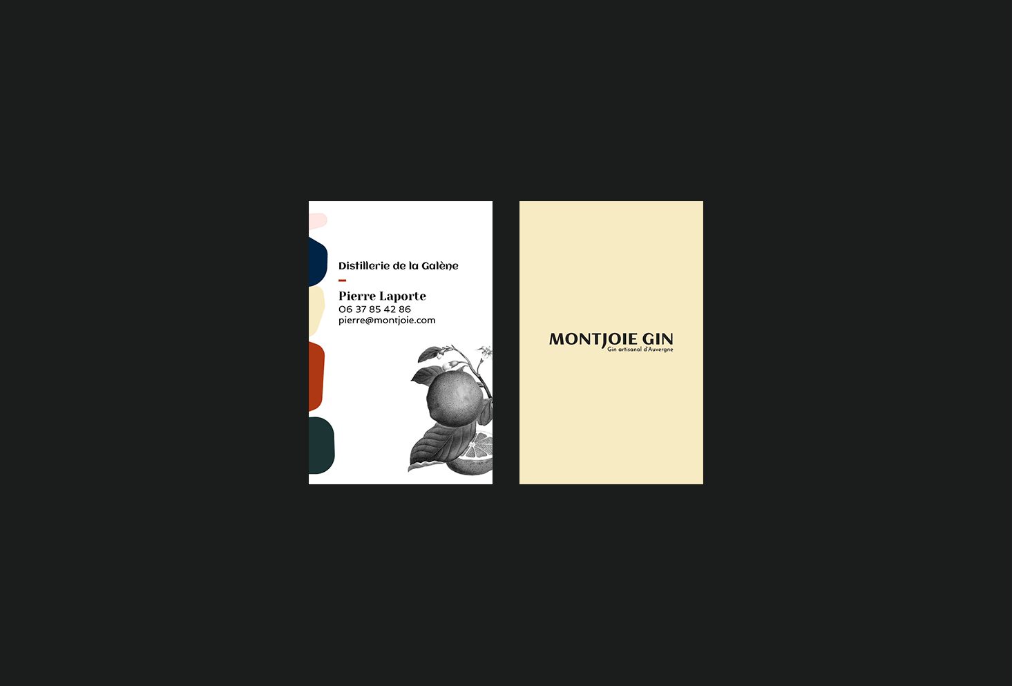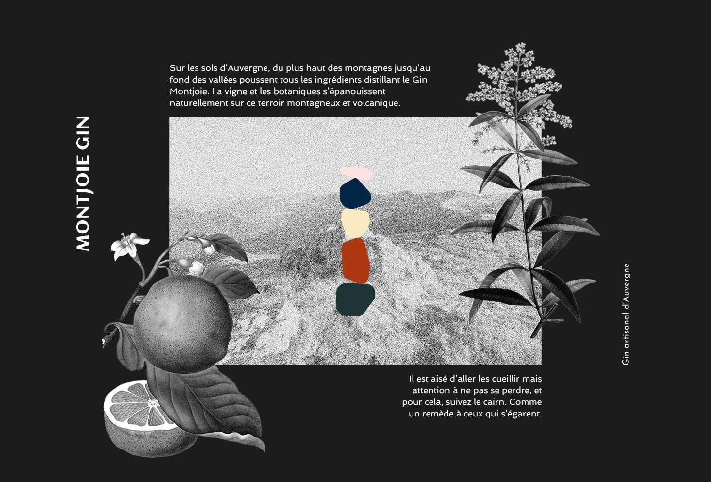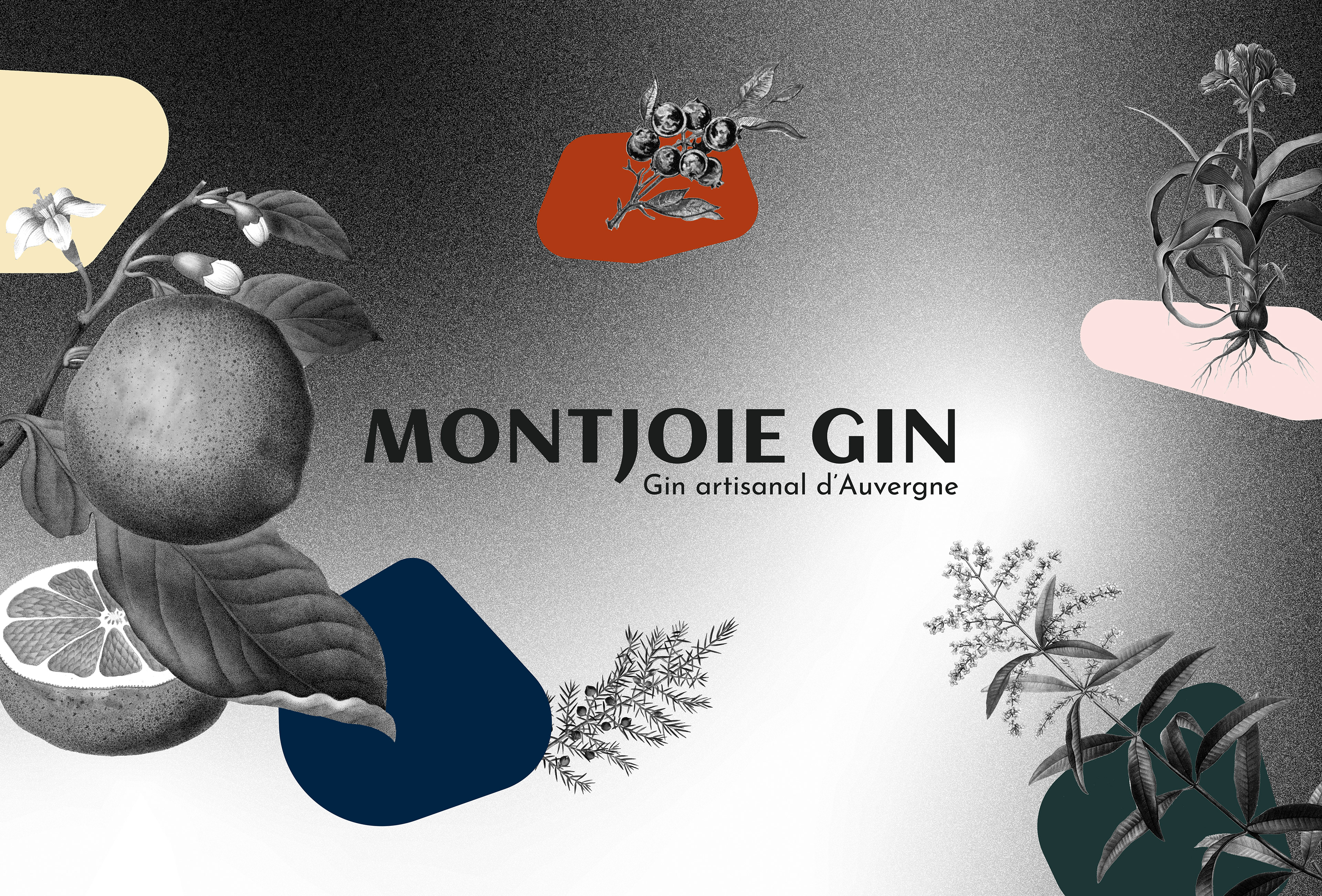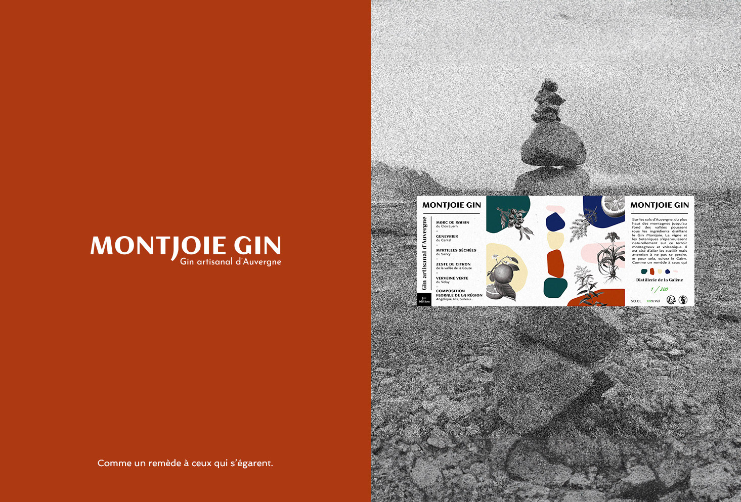 Création de l'identité visuelle du gin artisanal Montjoie. L'alcool est distillé en Auvergne et les arômes du gin sont tous issus de ces terres volcaniques. Déclinaison sur l'étiquette de la bouteille ainsi que les différents supports de communication.